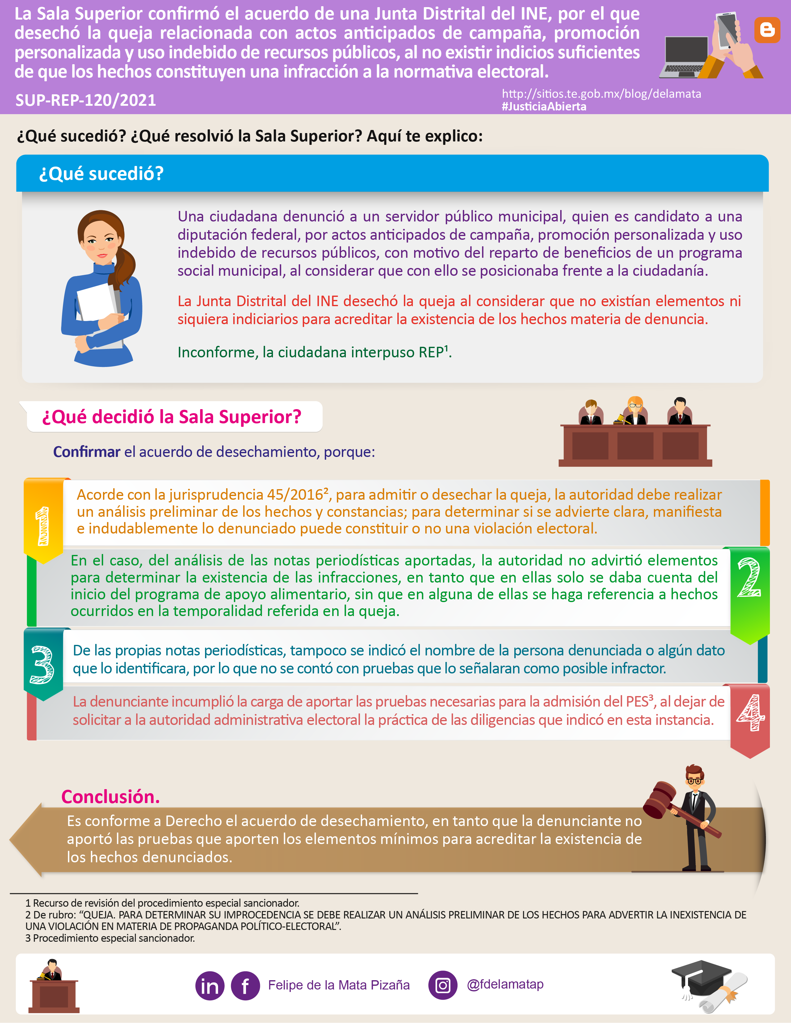 Descargar infografíaLa Sala Superior confirmó el acuerdo de una Junta Distrital del INE, por el que desechó la queja relacionada con actos anticipados de campaña, promoción personalizada y uso indebido de recursos públicos, al no existir indicios suficientes de que los hechos constituyen una infracción a la normativa electoral.
