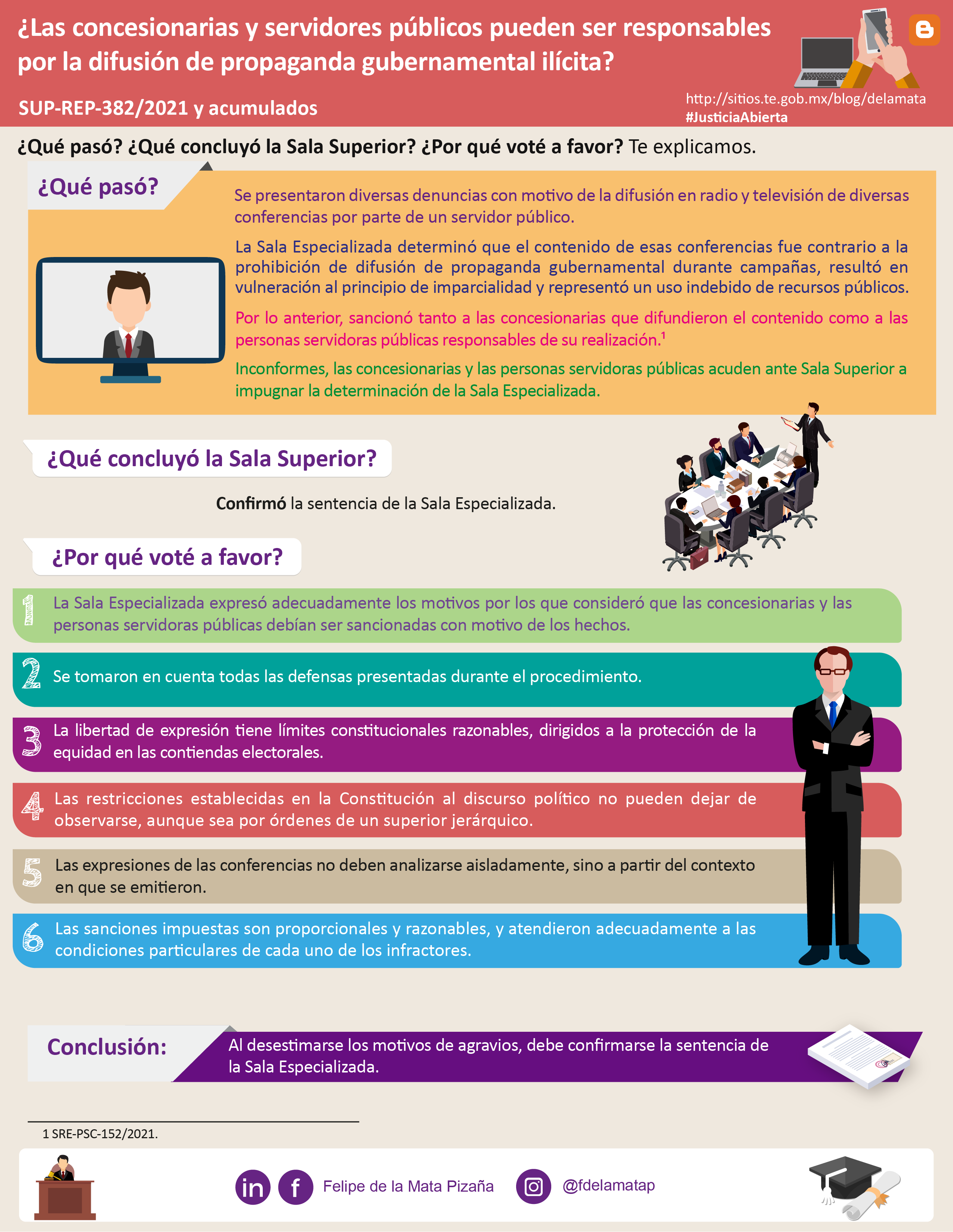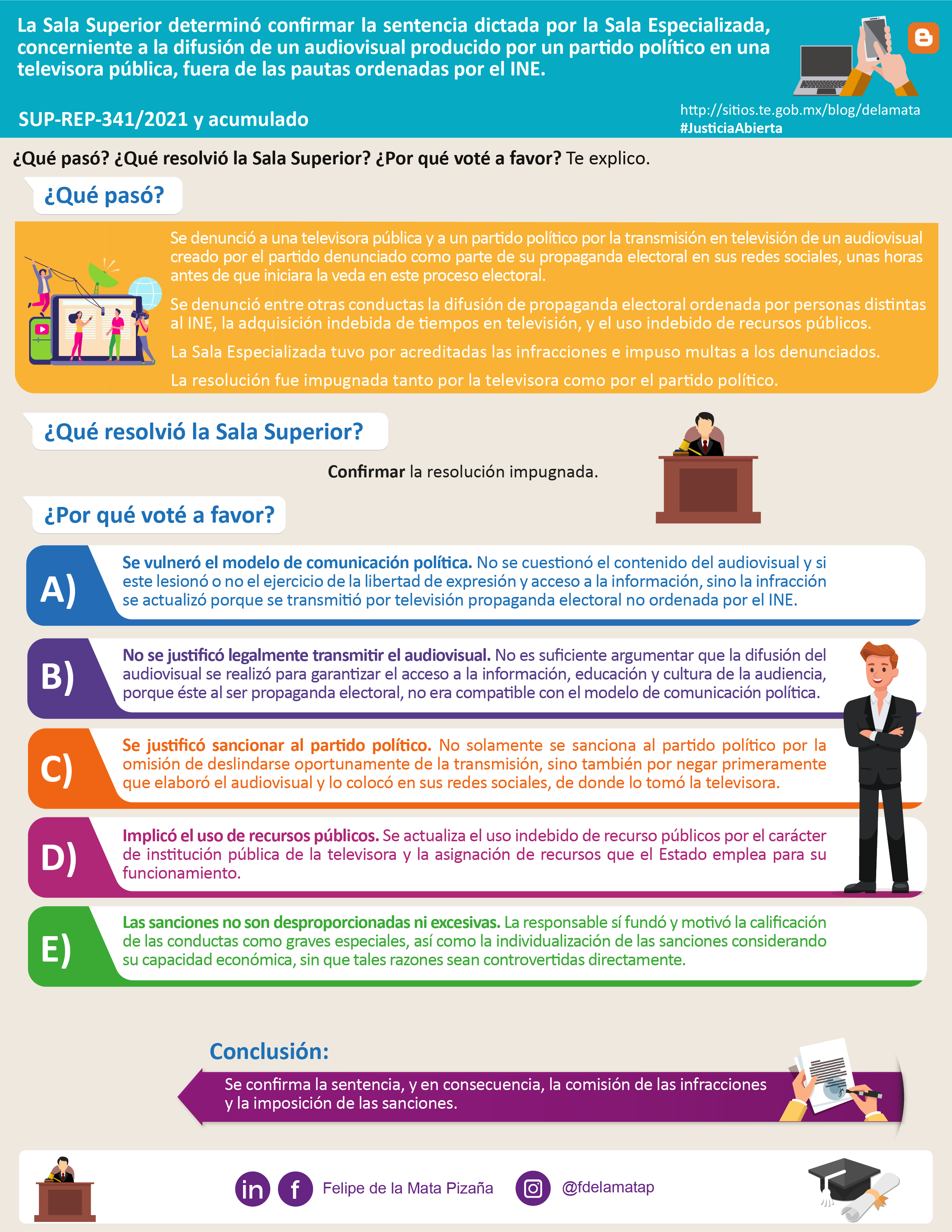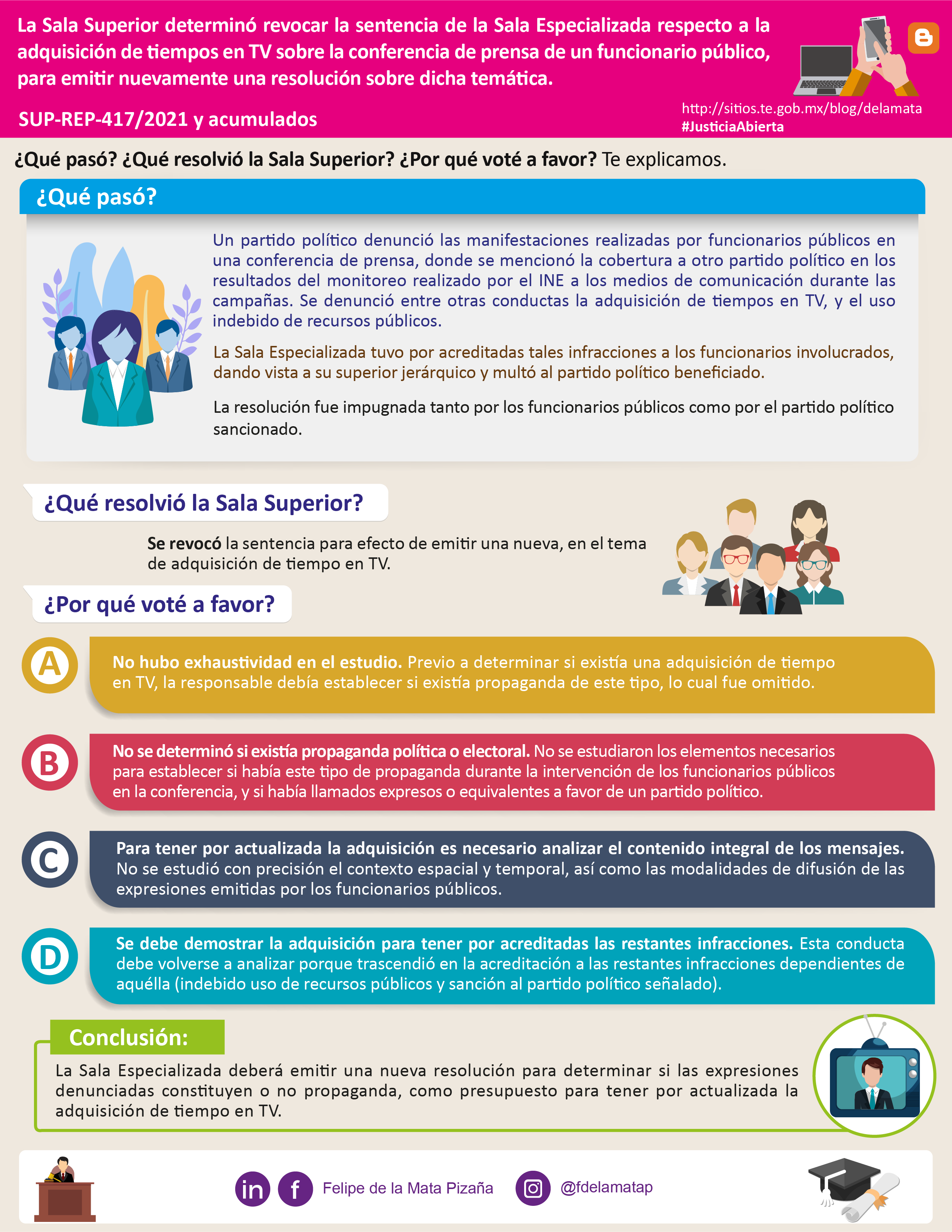 Descargar infografíaLa Sala Superior determinó revocar la sentencia de la Sala Especializada respecto a la adquisición de tiempos en TV sobre la conferencia de prensa de un funcionario público, para emitir nuevamente una resolución sobre dicha temática.