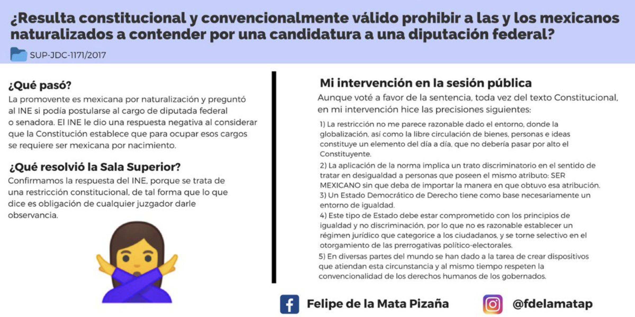 Sentencia completa Descargar infografía¿Resulta constitucional y convencionalmente válido prohibir a las y los mexicanos naturalizados a contender por una candidatura a una diputación federal? SUP-JDC-1171/2017