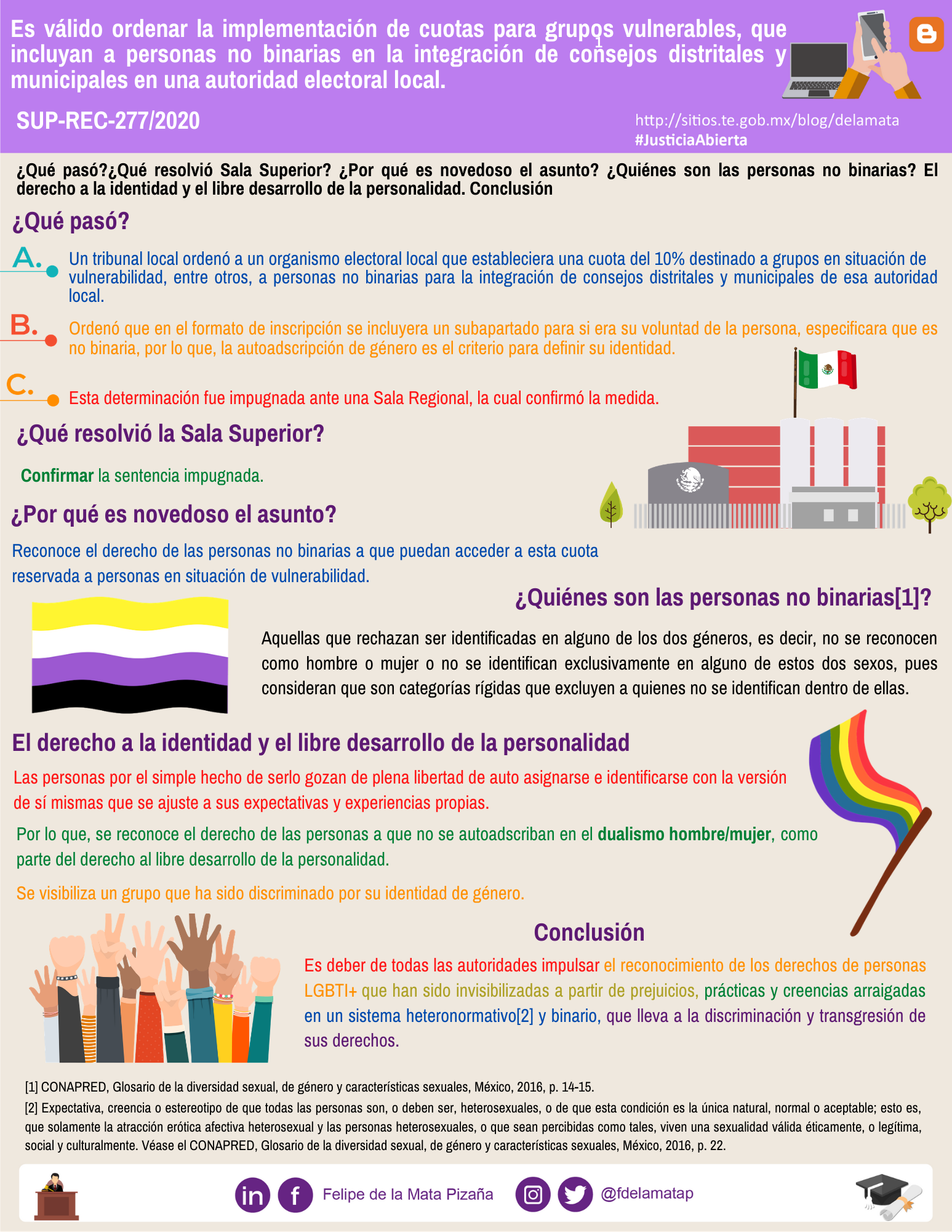 Descargar infografíaEs válido ordenar la implementación de cuotas para grupos vulnerables, que incluyan a personas no binarias en la integración de consejos distritales y municipales en una autoridad electoral local.